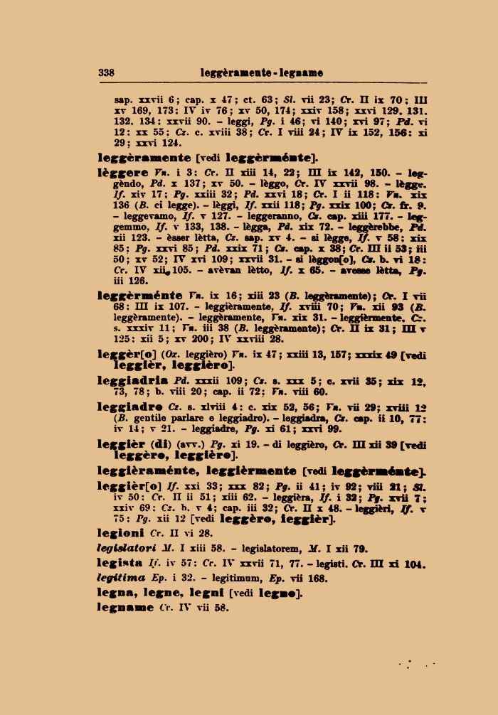 lèggere F». i 3: Cr. n xiii 14, 22; m ix 142, 150. - log-gèlido, Pd. x 137; xv 50. - lèggo, Cr. IV xxvii 98. - lègge. lf. xiv 17; Pg. xxiii 32; Pd. xxvi 18; Or. I ii 118: Va. xix 136 (B. ci legge). - lèggi, If. xxii 118; Pg. xxix 100; Cz. fr. 9. - leggevamo, If. v 127. - leggeranno, Cr. cap. xiii 177. - leggemmo, If. v 133, 138. - lègga, Pd. xix 72. - leggèrebbe, Pd. xii 123. - èsser lètta, Cz. gap. xv 4. - si lègge, If. v 58 ; xix 85; Pg. xxvi 85; Pd. xxix 71 ; Cr. cap. x 38; Cr. Ili ii 53; iii 50; xv 52; IV xvi 109; xxvii 31. - si lèggon[o], Cr. b. vi 18: Cr. IV xii, 105. - avèvan lètto, lf. x 65. - avesse lètta, P,. iii 126.