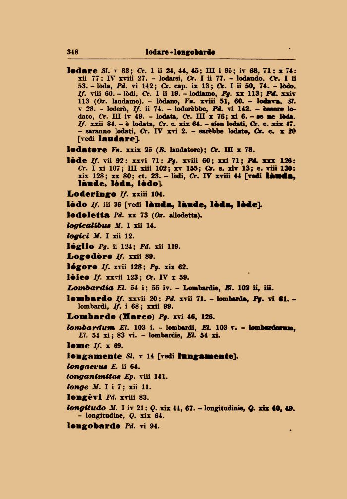 lodare SI. v 83 ; Cr. 1 ii 24, 44, 45 ; III i 95 ; iv 68, 71 : x 74 : xii 77 : IV xviii 27. - lodarsi, Cr. I ii 77. - lodando, O. I ii 53. - loda, Pd. vi 142; Cz. cap. ix 13; Or. I ii 50, 74. - lòdo. If. viii 60. - lòdi. Cr. I ii 19. - lodiamo, Pg. xx 113; Pd. xxiv 113 (Ox. laudami»). - lòdano, Vn. xviii 51, 60. - lodava. SI. v 28. - loderò. If. ii 74. - loderèbbe, Pi. vi 142. - èeseie Iodato, Cr. Ili iv 49. - lodata, Cr. III x 76; xi 6. - se ne lòda. If. xxii 84. - è lodata, Cz. c. xix 64. - sien lodati, Cr. c. xix 47.