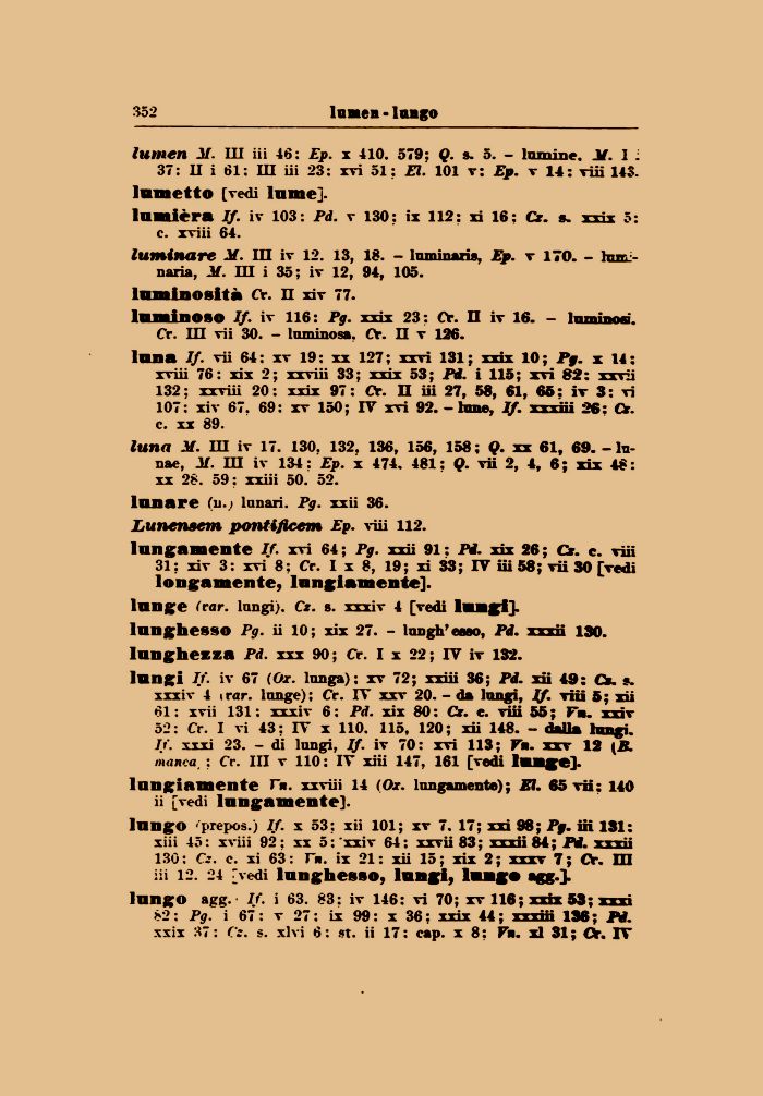 luna If. vii 64: xv 19: xx 127; xxvi 131; xxix 10; i»f. x 14: xviii 76: xix 2; xxviii 33; xxix 53; Pd. i 115; xtì 82: xxvii 132 ; xxviii 20 : xxix 97 : Cr. II iii 27, 58, 61, 65 : Iv 3 : vi 107: xiv 67. 69: xv 150; IV xvi 92. - lune, If. xxxiii 26: Cr. c. xx 89.
