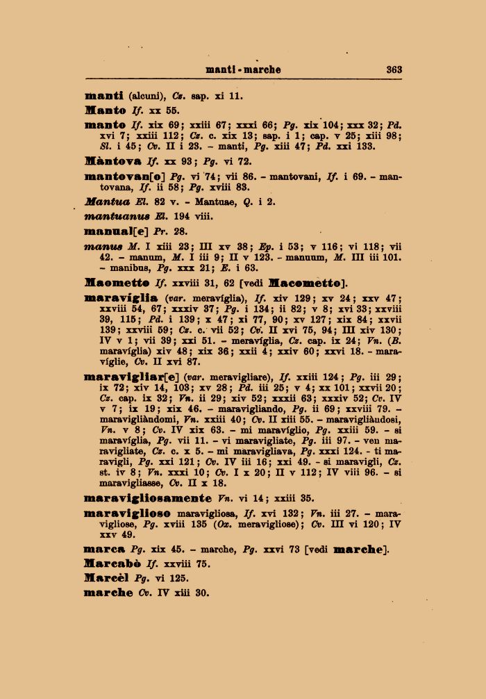 maraviglia (var. meraviglia), If. xiv 129; xv 24; xxv 47; xxviii 54, 67; xxxiv 37; Pg. i 134; ii 82; v 8; xvi 33; xxviii 39, 115; Pd. i 139; x 47; xi 77, 90; xv 127; xix 84; xxvii 139; xxviii 59; Cz. c. vii 52; Cv. II xvi 75, 94; III xiv 130; IV v 1; vii 39; xxi 51. - meraviglia, Cz. cap. ix 24; Vn. (B. maraviglia) xiv 48 ; xix 36 ; xxii 4 ; xxiv 60 ; xxvi 18. - maraviglie, Cv. II xvi 87.