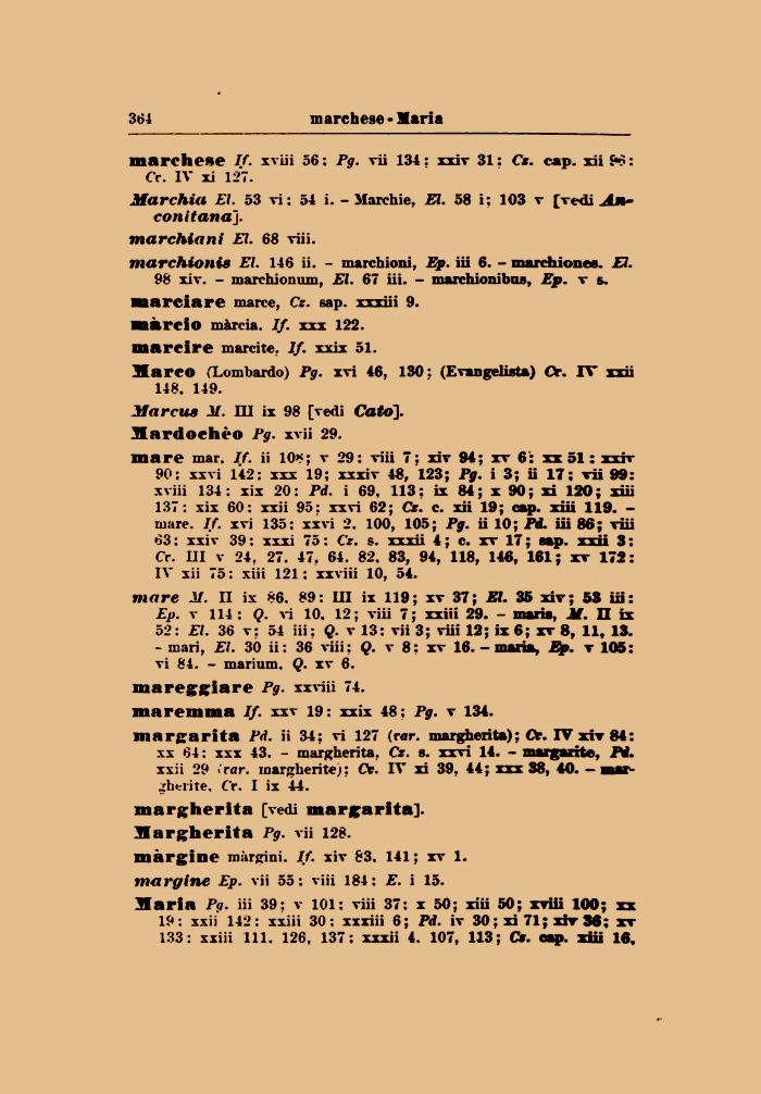 mare mar. If. ii 108; v 29: viii 7: xiv 94; xv 6: xx 51 : xxiv 90; xxvi 142: xxx 19; xxxiv 48, 123; Pg. i 3; ii 17; vii 99: xviii 134: xix 20: Pd. i 69, 113: ix 84; x 90; xi 120; xiii 137: xix 60: xxii 95: xxvi 62; Cz. c. xii 19; cap. xiii 119. -mare. If. xvi 135: xxvi 2. 100, 105; Pg. ii 10; Pi. iii 86; viii 63 : xxiv 39 : xxxi 75 : Cz. s. xxxii 4 ; c. xv 17 ; sap. xxii 3 : Cr. Ili v 24, 27. 47, 64. 82, 83, 94, 118, 146, 161; xv 172: IV xii 75: xiii 121; xxviii 10, 54.