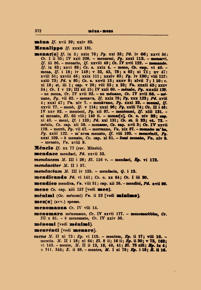 saenar[e] If. ix 5; xxix 76; Pg. xxi 33; Pd. iv 66; xxvi 54: Cr. I ii 35; IV xxii 208. - menarmi, Pg. xxxi 113. - menarvi. If. iii 86. - menarlo, If. xxviii 49 ; Ór. IV xvii 122. - menando. If. ix 83 ; xxvi 88 ; Cz. s. xxix 4. - meno, Cz. cap. vi 40. -mena, If. i 18; iv 149; v 32, 43, 78; x 62; xi 71 ; xv 47: xviii 51 ; xxviii 46 ; xxix 111 ; xxxiv 63 ; Pg. iv 120 ; viii 112 : xxiii 73; Pd. x 95; Cz. a. xxvii 13; xxxv 9; xlvii 7; 1 10: e. xi 18; st. iii 1; cap. v 28; viii 53; x 23; Fa. xxxii 45; xxxv 54 ; Cr. I v 19 ; HI xii 15 ; IV xxii 60. - ménalo, Pg. xxxiii 128.