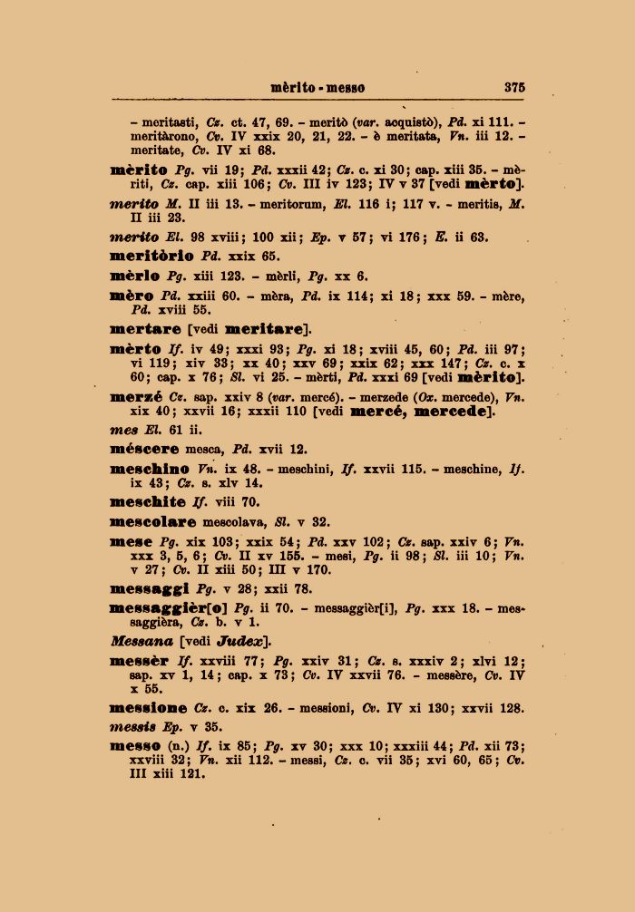 mèrito Pg. vii 19; Pd. xxxii 42; Cz. e. xi 30; cap. xiii 35. - mèriti, Cz. cap. xiii 106 ; Cv. Ili iv 123 ; IV v 37 [vedi mèrto].