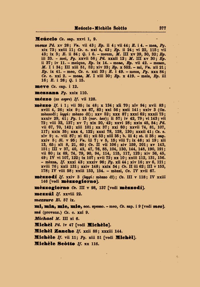 mèzzo I/. i 1; vii 35; ix 48; x 134; xii 70; xiv 94; xvii 83; xviii 4, 26 ; xix 9 ; xx 67, 83 ; xxi 56 ; xxii 141 ; xxiv 3 (Ox. mèzzodì ; leggi : mèzzo d£) ; xxv 52 ; xxx 87 ; xxxi 62 ; xxxii 73 ; xxxiv 29, 41; Pg. i 15 (var. àer); ii 57; iv 42, 79; vi 143; vii 72; viii 33, 137; xv 7; xix 20, 42; xxvi 28; xxix 45, 54; Pd. vii 67, 70, 142; xiii 101; xx 37; xxi 80; xxvii 74, 81, 107, 117; xxix 35; xxx 4, 122; xxxi 78, 128, 130; xxxii 41; Cz. s. xiv 9; c. viii 87; xi 61; xii 53; xiii 35; b. iii 4; st. ii 35; sap. xxiv 5 ; SI. v 95 ; Vn. iii 7 ; v 5, 15 ; viii 7 ; ix 46 ; xi 19 ; xii 13, 65; xii 8, 21, 60; Cv. II vii 106; xiv 159, 201; xv 143, 151; IH v 37, 40, 43, 47, 76, 85, 104, 130, 144, 148, 190, 191; vii 80 ; ix 69, 74, 79, 90, 94, 114, 115, 117, 123 ; xiv 36, 45, 49; IV vi 107, 122; ix 107 ; xvii 72; xx 10; xxiii 112, 131, 156. - mèzza, If. xxxi 43; xxxiv 96; Pg. xii 44; xiv 16; xv 6, 121; xviii 76 ; xxii 131 ; xxiv 148 ; xxix 54 ; Cv. n iii 62 ; Ul v 153, 178; IV viii 58; xxiii 153, 154. - mèzzi, Cv. IV xvii 67.