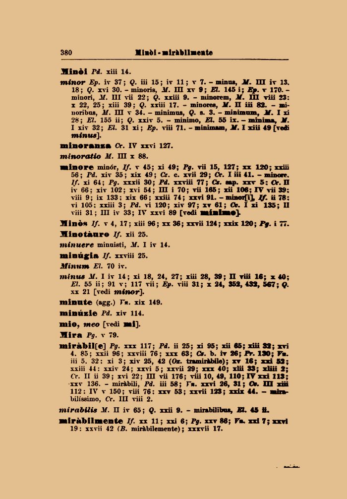 minor Ep. iv 37 ; Q. iii 15 ; iv 11 ; v 7. - minila, M. HI iv 13. 18 ; Q. xvi 30. - minori», il. Ili xv 9 ; El. 145 i ; Ep. v 170. -minori, il. Ili vii 22; Q. xxiii 9. - minorem, M. III tììì 23: x 22, 25 ; xiii 39 : Q. xxiii 17. - minore», M. II iii 82. - mi-uoribn», if. Ili v 34. - minimo», Q. 8. 3. - minimum, M. I xi 28 ; El. 155 ii ; Q. xxiv 5. - minimo, El. 55 ix. — Jf.