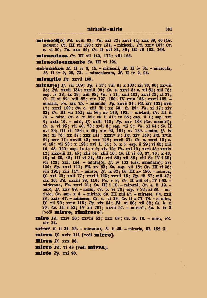 mĖrācol[o] Pd. xviii 63; Vn. xxi 22; xxvi 44; xxx 39, 40 (Ox. manca) ; 0ģ. Ili vii 170 ; xiv 131. - mirācoli, Pd. xxiv 107 ; Cz. c. vi 50 ; Vn. xxx 34 ; Cv. II xvi 84, 86 ; III vii 163, 168.