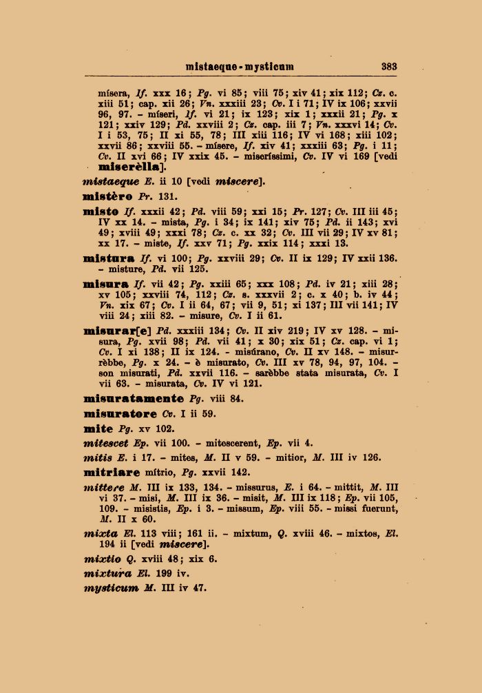 misera, lf. xxx 16; Pg. vi 85; viii 75; xiv 41; xix 112; Cz. e. xiii 51; cap. xii 26; Vn. xxxiii 23; Cv. I i 71; IV ix 106; xxvii 96, 97. - miseri, lf. vi 21; ix 123; xix 1; xxxii 21; Pg. x 121; xxiv 129; Pd. xxviii 2; Cz. cap. iii 7; Vn. xxx vi 14; Cv. I i 53, 75 ; II xi 55, 78 ; III xiii 116 ; IV vi 168 ; xiii 102 ; xxvii 86; xxviii 55. - misere, If. xiv 41; xxxiii 63; Pg. i 11; Cv. II xvi 66 ; IV xxix 45. - miserlssimi, Cv. IV vi 169 [vedi miserèlla]. mistaeque E. ii 10 [vedi miscere]. mistèro Pr. 131.