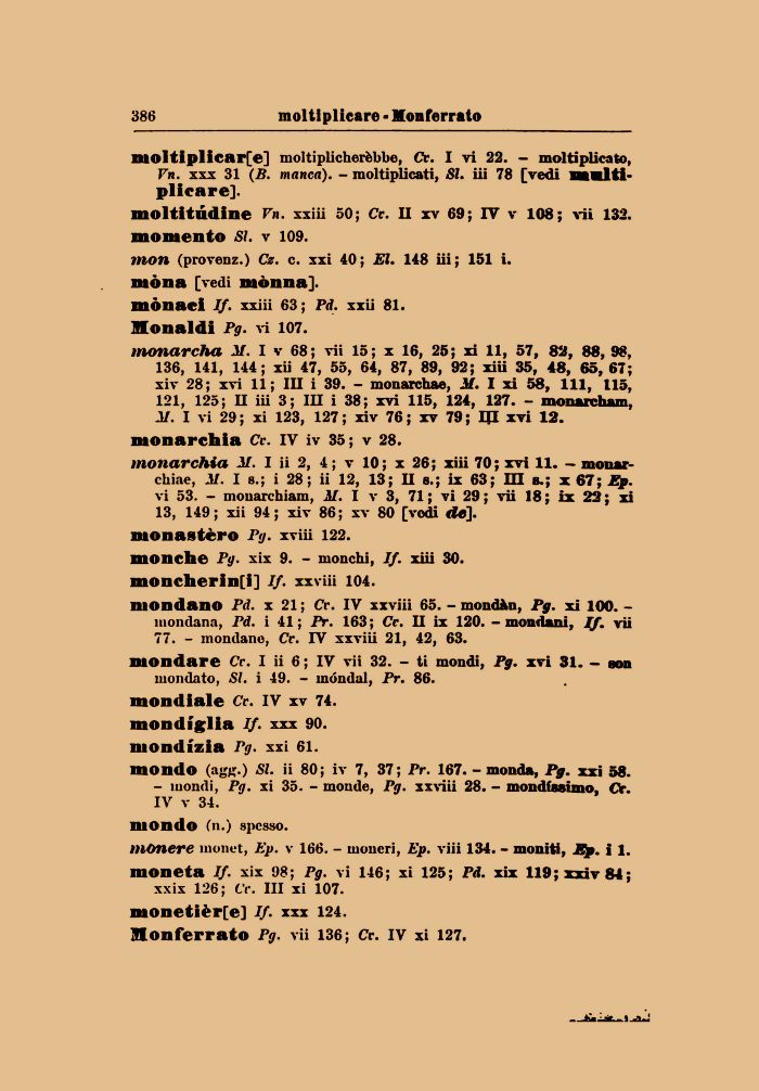 - mondi, Pg. xi 35. - monde, Pg. xxviii 28. - mondissimo, Clr. IV v 34.
