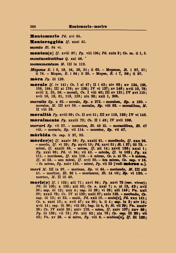 morale If. iv 141 ; Cv. I xi 47 ; II i 42 ; xiv 63 ; xv 124, 125, 158, 164; HI xi 176; xv 126; IV vi 137; xv 148; xvii 10, 79; xviii 2, 23, 59. - morali, Cv. I viii 40; HI xv 121 ; IV xvi 115; xvii 16, 19, 81, 118, 123; xix 38; xxii 1, 205.