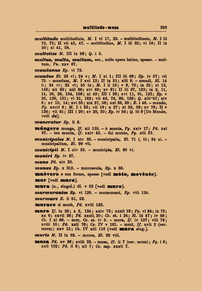 mundus El. 23 vi; 24 v; M. I xi 1; III iii 69; Ep. iv 57; vii 75. - mundum, M. I xvi 12; II ix 51; xiii 9. - mundi, El. 14 ii; 24 vi; 32 vi; 55 ix ; M. I ii 10 ; v 9, 70 ; ix 22 ; xi 12, 149; xii 93; xiii 69; xiv 85; xv 81; II iii 87, 123; ix 2, 11, 14, 26, 28, 104, 108; xi 49; III i 39; xvi 11, 91, 123; Ep. v 26, 120, 131; vi 31, 182; vii 46, 74, 95, 126; Q. xiii-47; xiv 8 ; xv 10, 14 ; xvi 55 ; xix 57, 58; xxi 39, 65 ; -E. i 48. - mnndo, Pg. xxvii 8 ; M. I i 33 ; vii 19 ; x 27 ; xi 55, 59 ; xv 79 ; II v 136 ; vii 61 ; III i 29 ; xv 29, 30 ; Ep. iv 56 ; Q. iii 9 [De Mnndo, vedi de\.