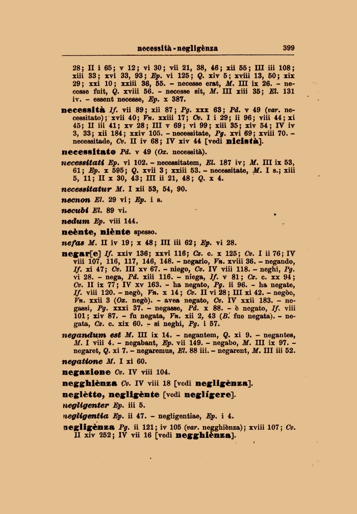 negar[e] If. xxiv 136; xxvi 116; Cz. c. x 125; Cv. I ii 76; IV viii 107, 116, 117, 146, 148. - negarlo, Vn. xviii 36. - negando, If. xi 47; Cv. IU xv 67. - niego, Cv. IV viii 118. - neghi, Pg. vi 28. - nega, Pd. xiii 116. - niega, lf. v 81 ; Cz. c. xx 94 ; Cv. II ix 77; IV xv 163. - ha negato, Pg. ii 96. - ha negate, If. viii 120. - negò, Vn. x 14 ; Cv. II vi 28 ; UI xi 42. - negòo, Vn. xxii 3 (Ox. negò). - avea negato, Cv. IV xxii 183. - negassi, Pg. xxxi 37. - negasse, Pd. x 88. - ò nogato, If. viii 101; xiv 87. - fu negata, Vn. xii 2, 43 (B'. fue negata). - negata, Cz. c. xix 60. - si neghi, Pg. i 57.