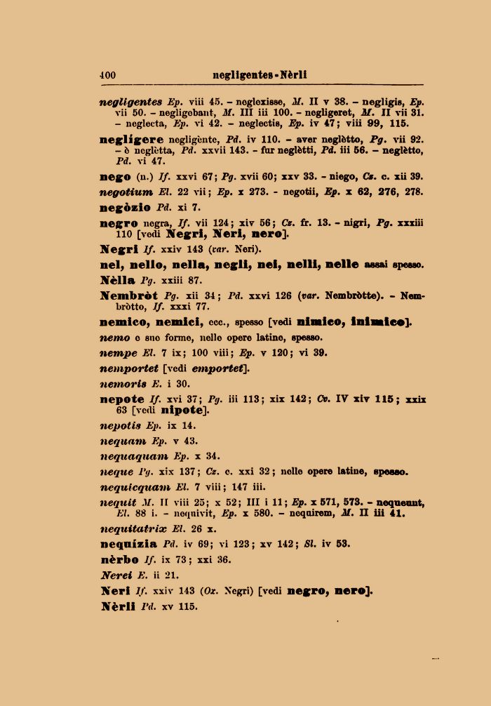 nego (n.) If. xxvi 67; Pg. xvii 60; xxv 33. - niego, Cz. c. xii 39. negotium El. 22 vii; Ep. x 273. - negotii, Ep. x 62, 276, 278. negòzio Pd. xi 7.