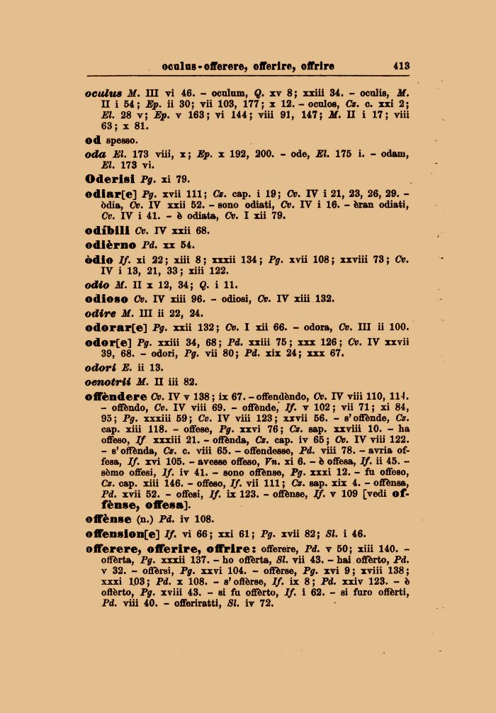 39, 68. - odori, Pg. vii 80; Pd. xix 24; xxx 67. odori E. ii 13. oenotrii M. II iii 82.