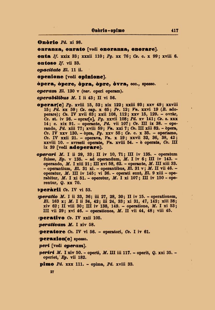 operar[e] Pg. xviii 15, 52; xix 122; xxiii 93; xxv 49; xxviii 15; Pd. xx 59; Cz. cap. x 65; Pr. 12; Vn. xxvi 19 (B. adoperare); Cv. IV xvii 63; xxii 108, 112; xxv 15, 129. - ovràr, Cz. st. iv 26. - oprar[e], Pg. xxvii 108; Pd. xv 141; Cz. s. xxx 14 ; c. xix 91. - operante, Pd. vii 107 ; Cv. Ili ix 38. - operando, Pd. xiii 77; xviii 59; Vn. xxi 7; Cv. Ili xiii 82. - òpera, Cv. IV xxv 130. - òpra, Pg. xxv 55 ; Cz. e. x 35. - operiamo, Cv. IV xxii 21. - operava, Vn. x 19 ; xxvii 32, 36, 38, 42 ; xxviii 10. - avresti operate, Vn. xviii 54. - è operata, Cv. Ili ix 39 [vedi adoperare].