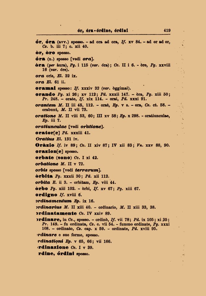 oramai spesso: If. xxxiv 32 (var. òggimai). orando Pg. xi 26; xv 112; Pd. xxxii 147. - óra, Pg. xiii 50; Pr. 248. - orate, If. xix 114. - orai, Pd. xxxi 91.