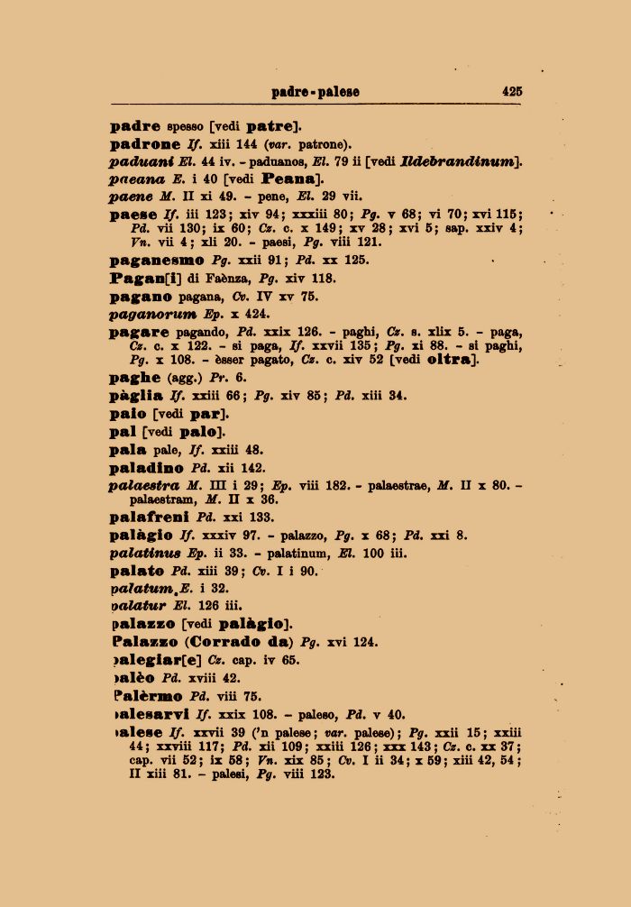 paese If. iii 123; xiv 94; xxxiii 80; Pg. v 68; vi 70; xvi 115; Pd. vii 130; ix 60; Cz. c. x 149; xv 28; xvi 5; sap. xxiv 4; Vn. vii 4 ; xii 20. - paesi, Pg. viii 121. paganesmo Pg. xxii 91 ; Pd. xx 125. Pagan[i] di Fačnza, Pg. xiv 118. pagano pagana, Cv. TV xv 75. paganorum Ep. x 424.