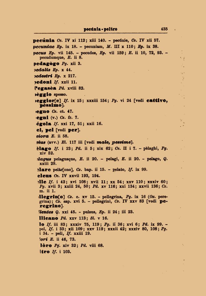 lo If. iii 83; xxxiv 75, 119; Pg. ii 36; xvi 6; Pd. ix 99. -pel, If. i 33; xii 109; xxv 119; xxxii 42; xxxiv 80, 108; Pg. i 34. - peli, If. xxiii 19.