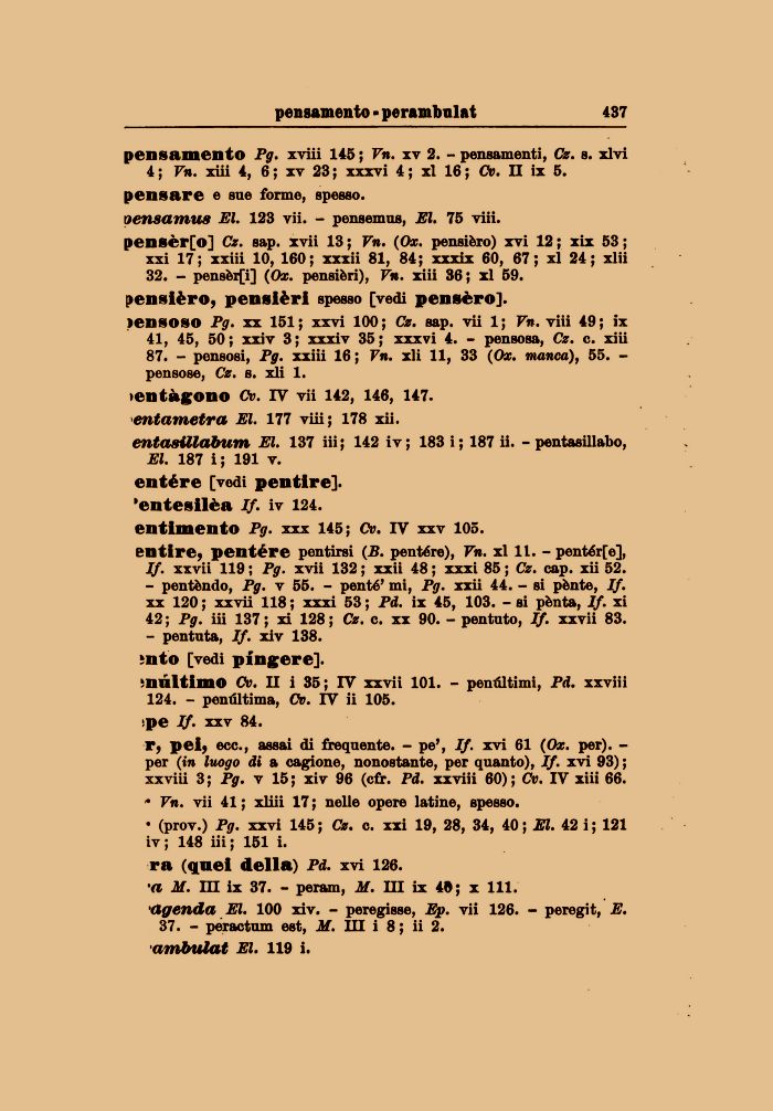 pensèr[o] Cz. sap. xvii 13 ; Vn. (Ox. pensièro) xvi 12 ; xix 53 ; xxi 17; xxiii 10, 160; xxxii 81, 84; xxxix 60, 67; xl 24; xiii 32. - pensèr[i] (Ox. pensièri), Vn. xiii 36 ; xl 59.