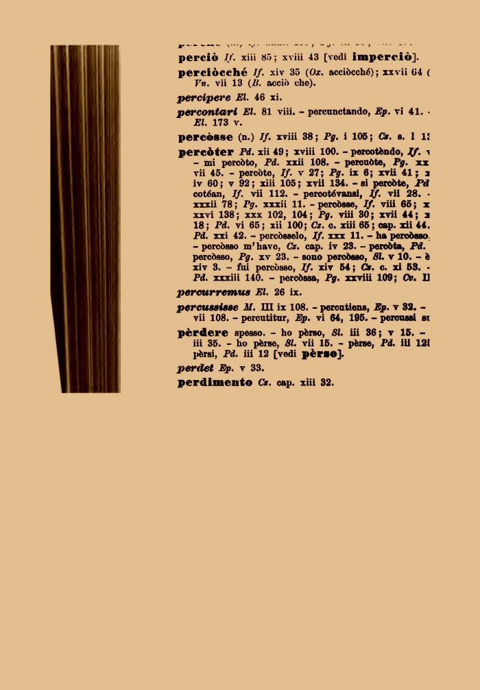 - mi percòto, Pd. xxii 108. - percuòte, Pg. xx vii 45. - percòto, If. v 27; Pg. ix 6; xvii 41 ; i iv 60 ; v 92 ; xiii 105 ; xvii 134. - si percòte, Pd cotéan, If. vii 112. - percotévansi, If. vii 28. ¦ xxxii 78; Pg. xxxii 11. - percòsse, If. viii 65; x xxvi 138; xxx 102, 104; Pg. viii 30; xvii 44; a 18; Pd. vi 65; xii 100; Cz. o. xiii 65; cap. xii 44. Pd. xxi 42. - porcòsselo, If. xxx 11. - ha percòsso.