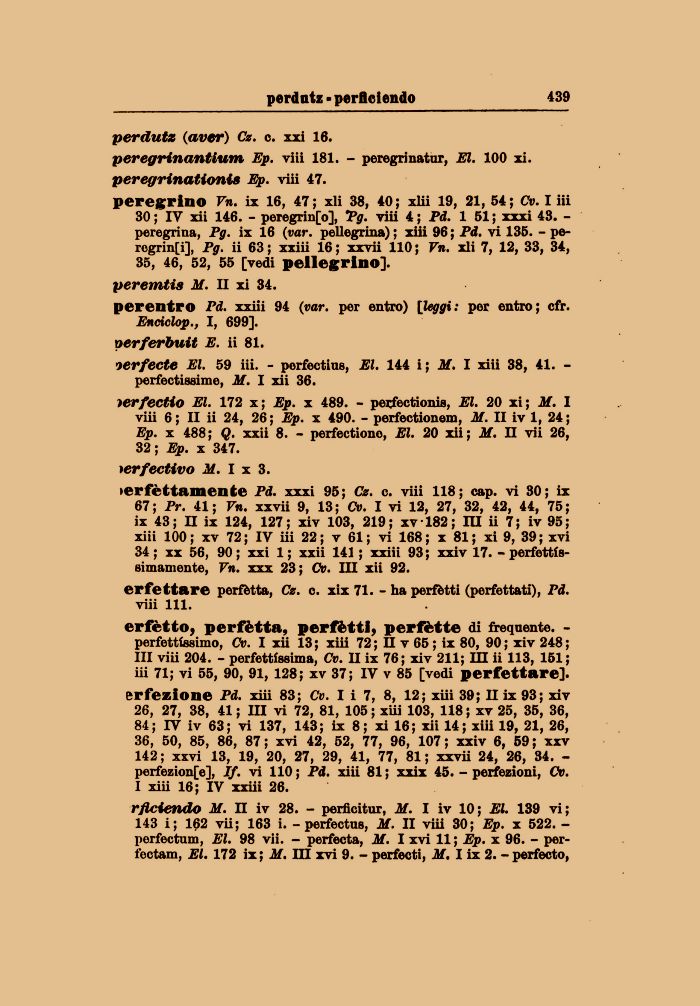 36, 50, 85, 86, 87; xvi 42, 52, 77, 96, 107; xxiv 6, 59; xxv 142; xxvi 13, 19, 20, 27, 29, 41, 77, 81; xxvii 24, 26, 34. -perfezione], If. vi 110 ; Pd. xiii 81 ; xxix 15. - perfezioni, Cv. I xiii 16; IV xxiii 26.