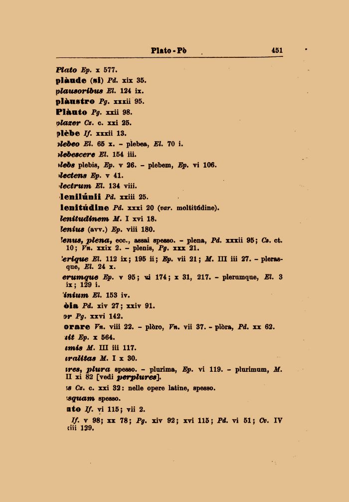 orare Vn. viii 22. - plòro, Vn. vii 37. - plòra, Pd. xx 62. lit Ep. x 564. imis M. ni iii 117. iralltas M. li 30.