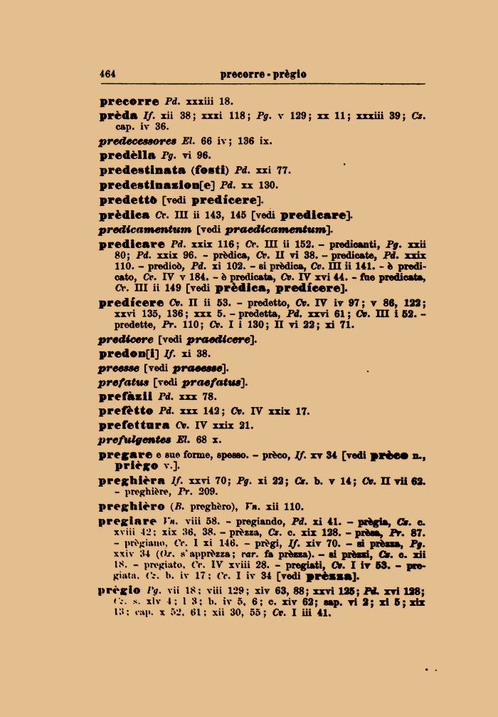 prègio Pg. vii 18: viii 129; xiv 63, 88; xxvi 125; Pd. xvi 128; Ci. s. xiv » ; 1 3; b. iv 5, 6 ; c. xiv 62; sap. vi 2; xi 6; xix