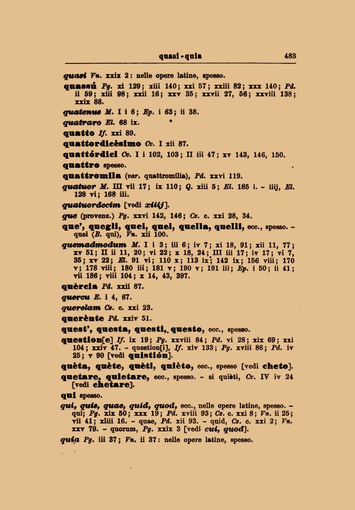 qui, quia, quae, quid, quod, ecc., nelle opere latine, spesso. -qui; Pg. xix 50; xxx 19; Pd. xviii 93; Cz. c. xxi 8; Vn. ii 25; vii 41; xliii 16. - quae, Pd. xii 93. - quid, Cz. c. xxi 2; Vn. xxv 79. - quorum, Pg. xxix 3 [vedi cui, quod]. quia Pg. iii 37 ; Vn. ii 37 : nelle opere latine, spesso.