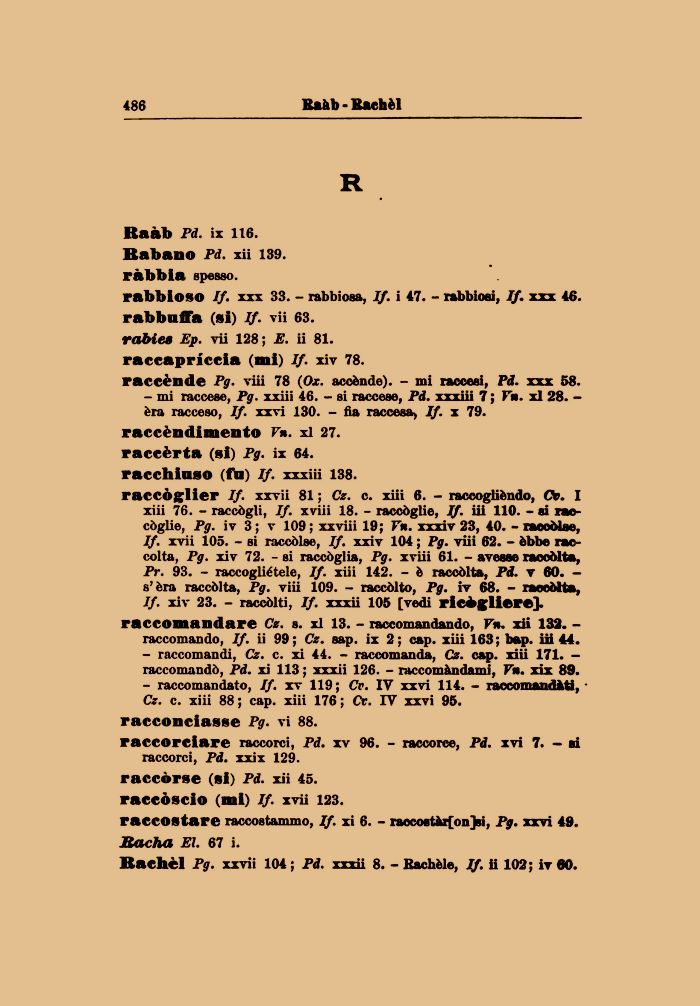 rabbioso If. xxx 33. - rabbiosa, If. i 47. - rabbiosi, If. xxx 46. rabbuffa (si) If. vii 63. rabiea Ep. vii 128; E. ii 81. raccapriccia (mi) lf. xiv 78.