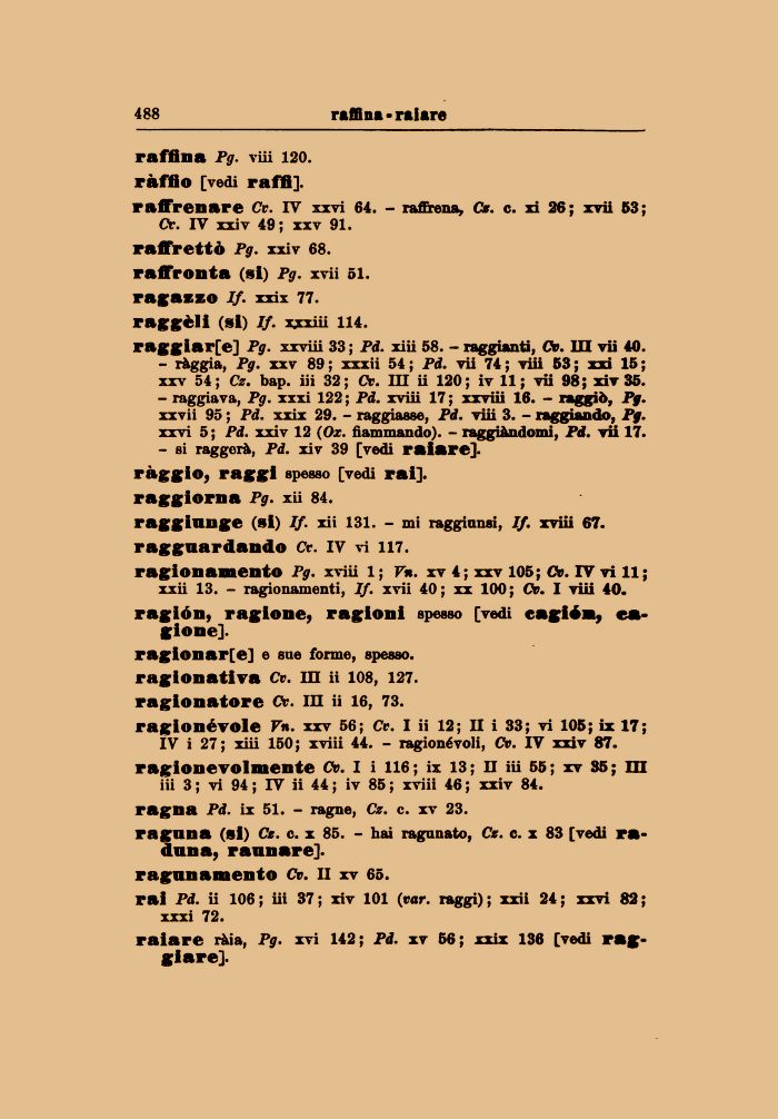 rai Pd. ii 106; iii 37; xiv 101 (var. raggi); xxii 24; xxvi 82; xxxi 72.