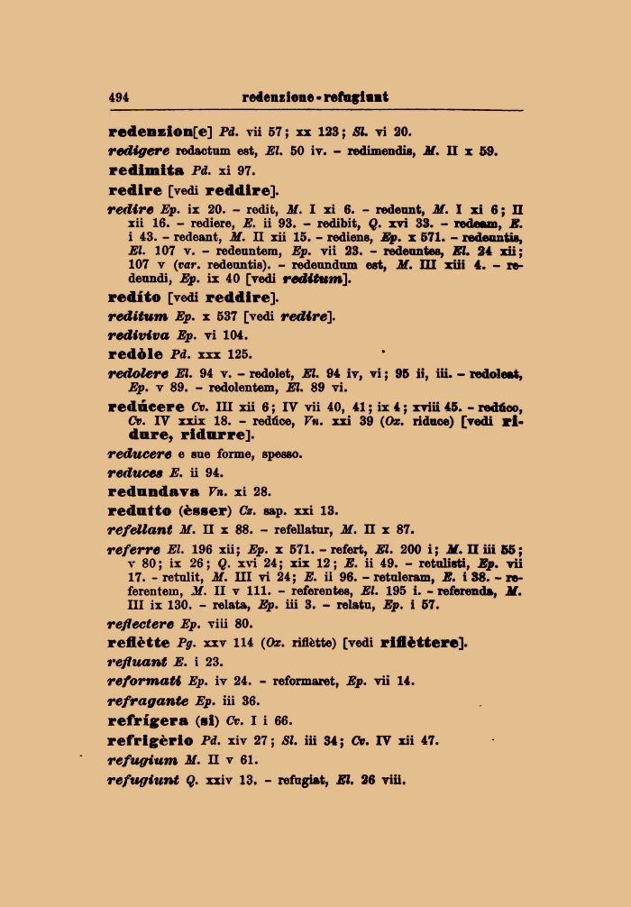 reddcere Cv. III xii 6 ; IV vii 40, 41 ; ix 4 ; xviii 45. - redtico, Cv. IV xxix 18. - redtìce, Vn. xxi 39 (Ox. riduce) [vedi ridare, ridarre]. reducere e sue forme, spesso. reduce» E. ii 94. redandava Vn. xi 28. redatto (èsser) Cz. sap. xxi 13. refellant il. II x 88. - refeUatur, M. H x 87.