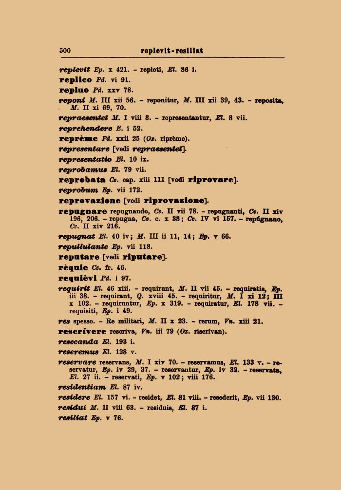 res spesso. - Re militari, M. II x 23. - rerum, Vn. xiii 21. rescrivere rescriva, Vn. iii 79 (Ox. riscrivan). resecando El. 193 i. reseremus El. 128 v.