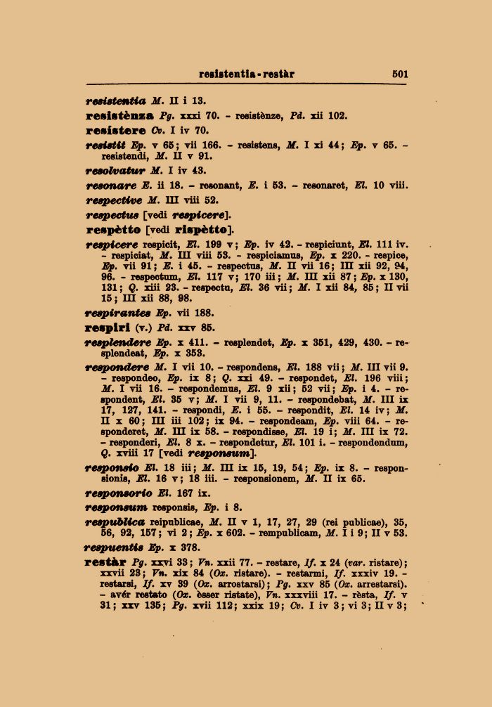 resonare E. ii 18. - resonant, E. i 53. - resonaret, El. 10 viii. reapective M. Ili viii 52. reapectus [vedi reapicere]. respètto [vedi rispètto].