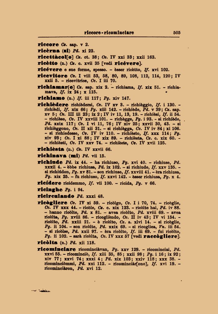 ricettàcol[o] Ce. ot. 38; Cv. IY xxi 33; xxii 163. ricètto (n.) Ce. o. xvii 35 [vedi ricévere], ricévere e sue forme, spesso. - èsser ricètto, lf. xvi 102. ricevitore Cv. I viii 53, 58, 80, 89, 108, 112, 114, 120; IV xxii 5. - rioevitrice, Cv. I iii 70.