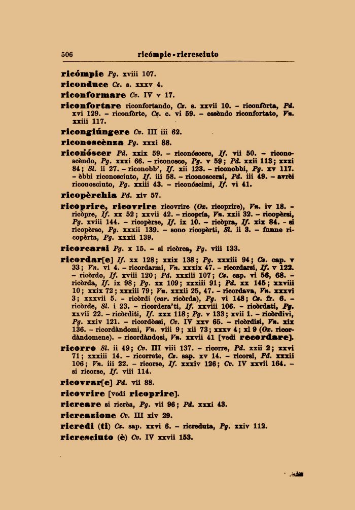 ricoprire, ricovrire ricovrire (Ox. ricoprire), Vn. iv 18. -ricòpre, If. xx 52 ; xxvii 42. - ricopria, Vn. xxii 32. - ricopèrsi, Pg. xviii 144. - ricopèrse, If. ix 10. - ricòpra, If. xix 84. - si ricopèrse, Pg. xxxii 139. - sono ricopèrti, SI. ii 3. - funne ricopèrta, Pg. xxxii 139.