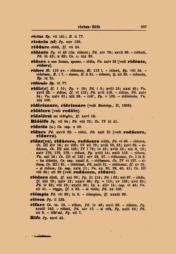 rictus Ep. rii 141 ; E. ii 77. ricucia (si) Pg. xxv 139. riddare riddi, If. vii 24.