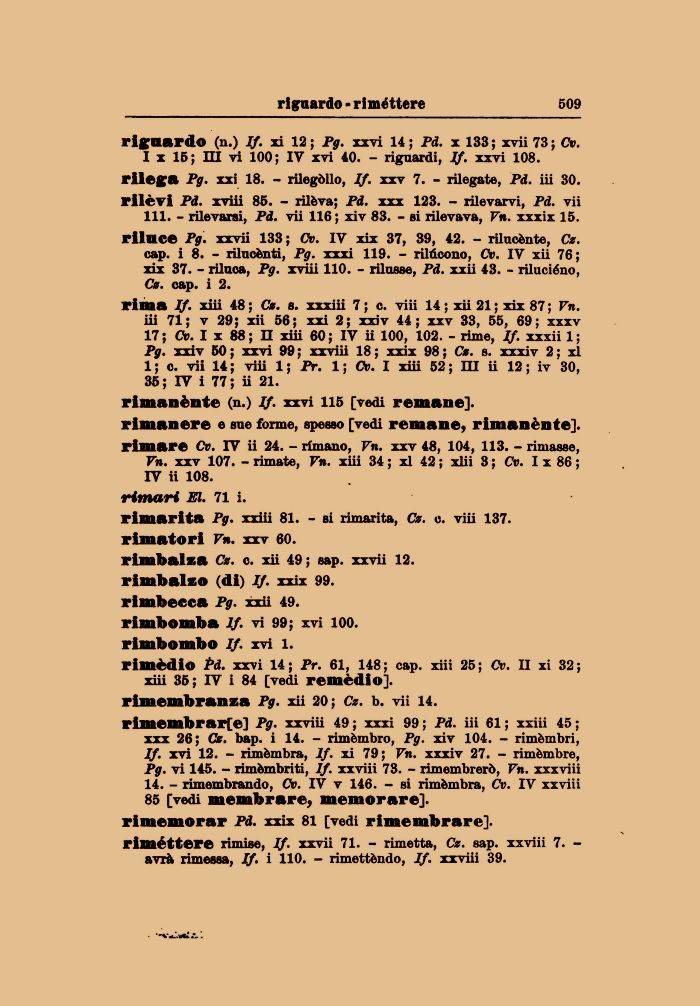 rima If. xiii 48 ; Cz. s. xxxiii 7 ; c. viii 14 ; xii 21 ; xix 87 ; Vn. iii 71; v 29; xii 56; xxi 2; xxiv 44; xxv 33, 55, 69; xxxv 17; Cv. I x 88; n xiii 60; IV ii 100, 102. - rime, If. xxxii 1; Pg. xxiv 50 ; xxvi 99 ; xxviii 18 ; xxix 98 ; Cz. s. xxxiv 2 ; xl 1 ; c. vii 14 ; viii 1 ; Pr. 1 ; Cv. I xiii 52 ; ni ii 12 ; iv 30, 35 ; IV i 77 ; ii 21.