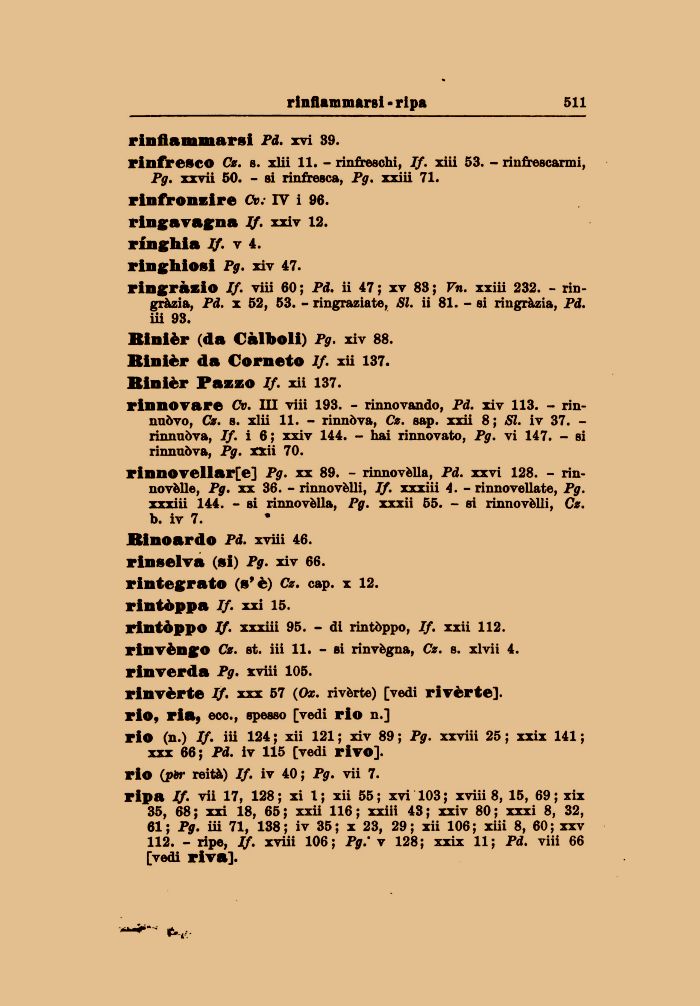 rinnovellar[e] Pg. xx 89. - riimovèlla, Pd. xxvi 128. - rinnovale, Pg. xx 36. - rinnovèlli, If. xxxiii 4. - rinnovellato, Pg. xxxiii 144. - si rinnovèlla, Pg. xxxii 55. - si rinnovèlli, Cz. b. iv 7. Binoardo Pd. xviii 46. rinselva (si) Pg. xiv 66. rintegrato (s'è) Cz. cap. x 12. rintòppa If. xxi 15.