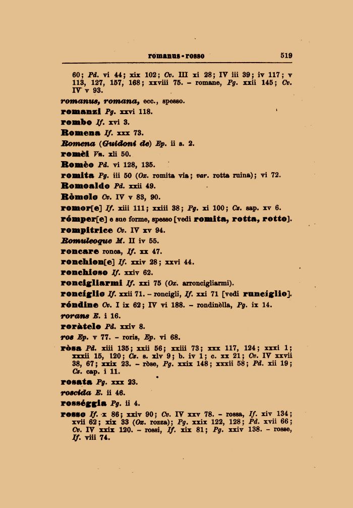 60; Pd. vi 44; xix 102; Cv. Ili xi 28; IV iii 39; iv 117; v 113, 127, 157, 168; xxviii 75. - romane, Pg. xxii 145; Cv. IT v 93.