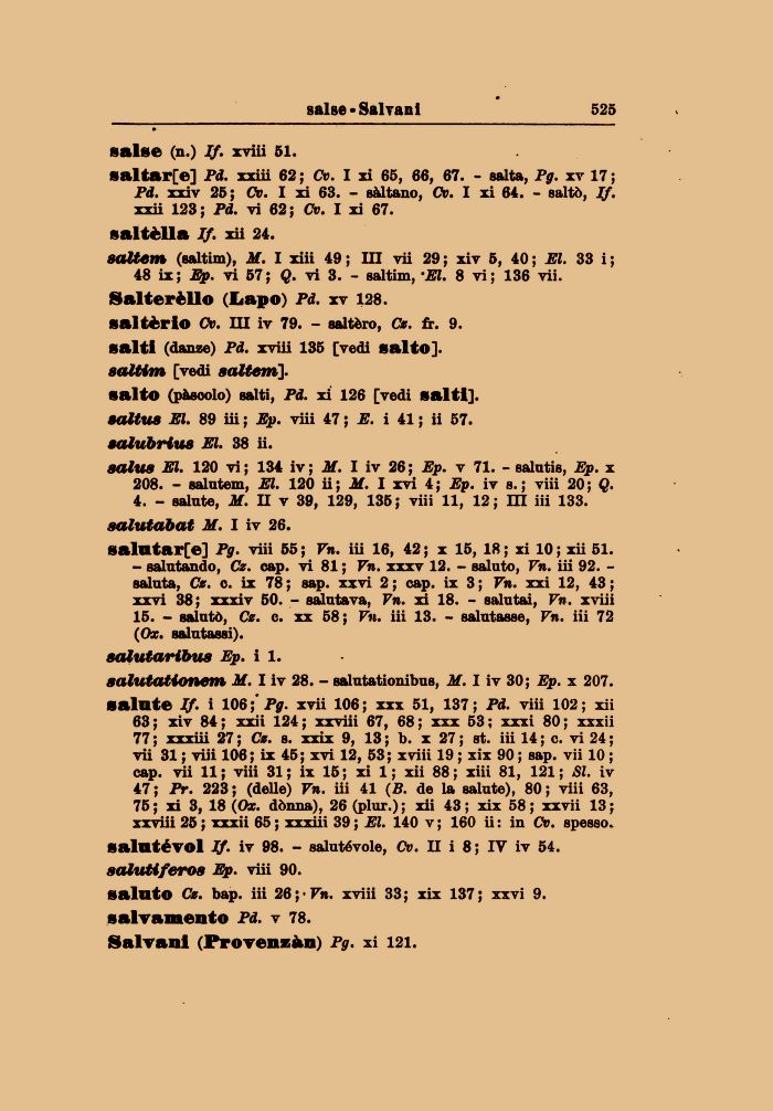 salntar[e] Pg. viii 55 ; Vn. iii 16, 42 ; x 15, 18 ; xi 10 ; xii 51. - salutando, Cz. cap. vi 81 ; Vn. xxxv 12. - saluto, Vn. iii 92. -saluta, Cz. e. ix 78 ; sap. xxvi 2 ; cap. ix 3 ; Vn. xxi 12, 43 ; xxvi 38; xxxiv 50. - salutava, Vn. xi 18. - salutai, Vn. xviii 15. - salutò, Cz. e. xx 58; Vn. iii 13. - salutasse, Vn. iii 72 (Ox. salutassi).