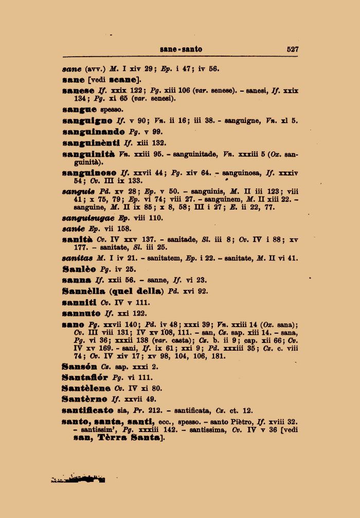 sano Pg. xxvii 140; Pd. iv 48; xxxi 39; Vn. xxiii 14 (Ox. sana); Cv. Ili viii 131 ; IV xv 108, 111. - san, Cz. sap. xiii 14. - sana, Pg. vi 36 ; xxxii 138 (var. casta) ; Cz. b. ii 9 ; cap. xii 66 ; Cv. IV xv 169. - sani, If. ix 61 ; xxi 9 ; Pd. xxxiii 35 ; Cz. c. viii 74 ; Cv. IV xiv 17 ; xv 98, 104, 106, 181.