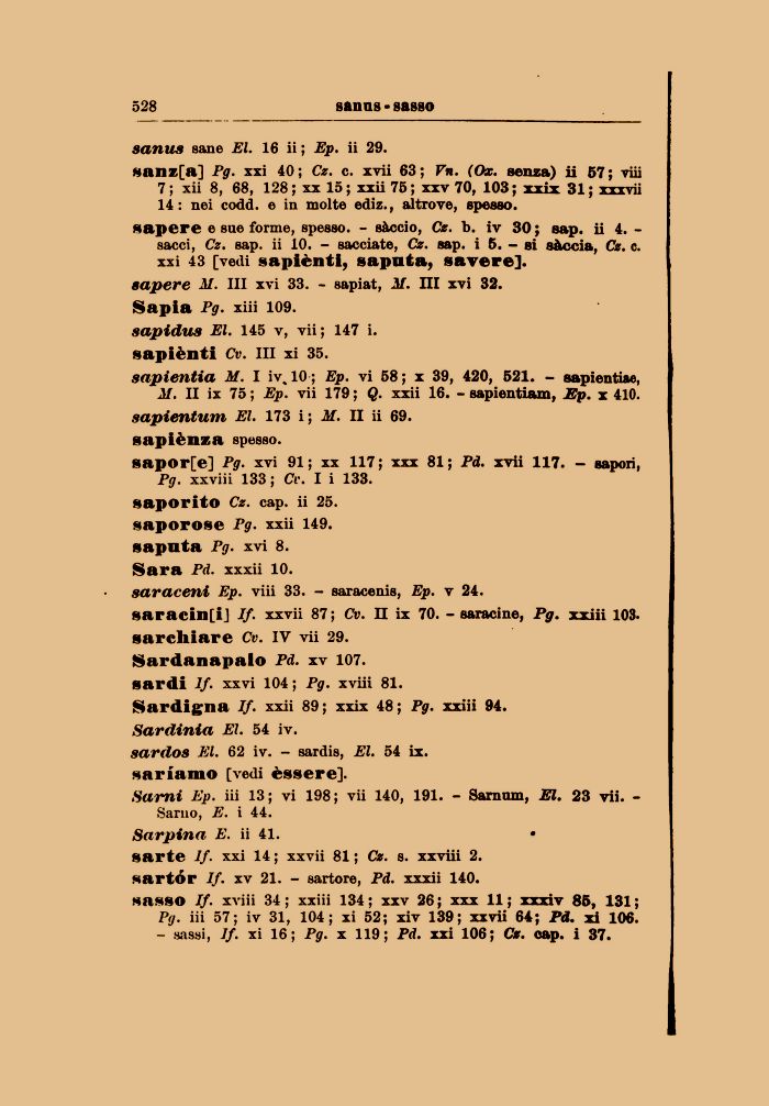 saporito Cz. cap. ii 25. saporose Pg. xxii 149. saputa Pg. xvi 8. Sara Pd. xxxii 10.