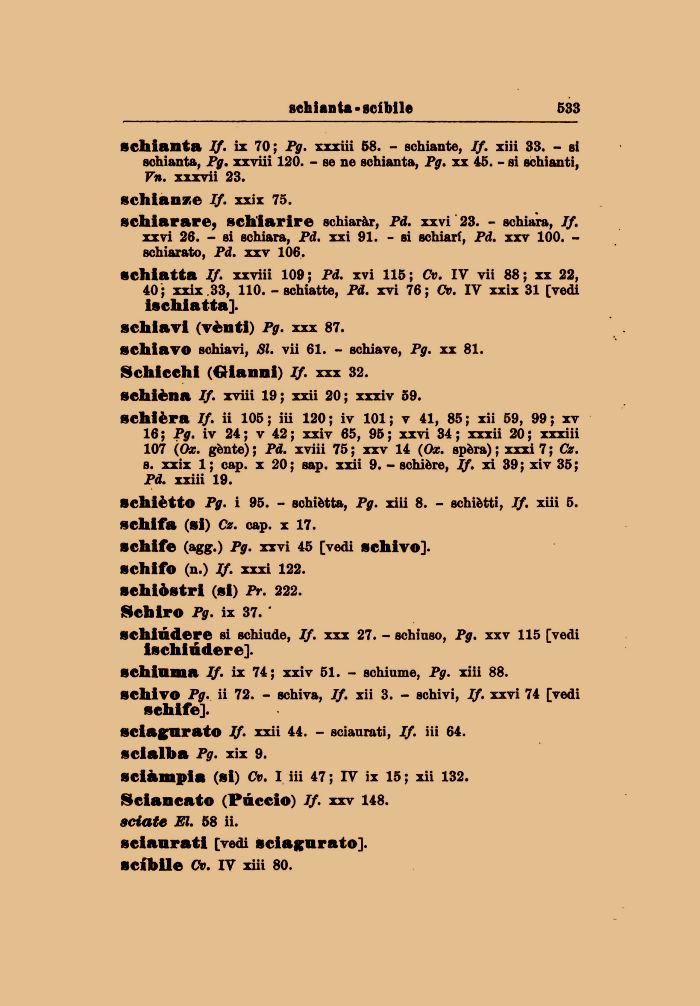 sciàmpia (si) Cv. I iii 47 ; IV ix 15 ; xii 132. Sciancato (Puccio) lf. xxv 148. sciate El. 58 ii.