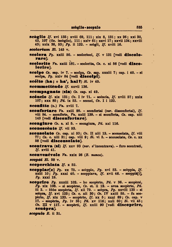 If. xviii 41. sconvenévole Vn. xxix 26 (B. manca), scopai El. 59 v. scoperchiata If. x 52.