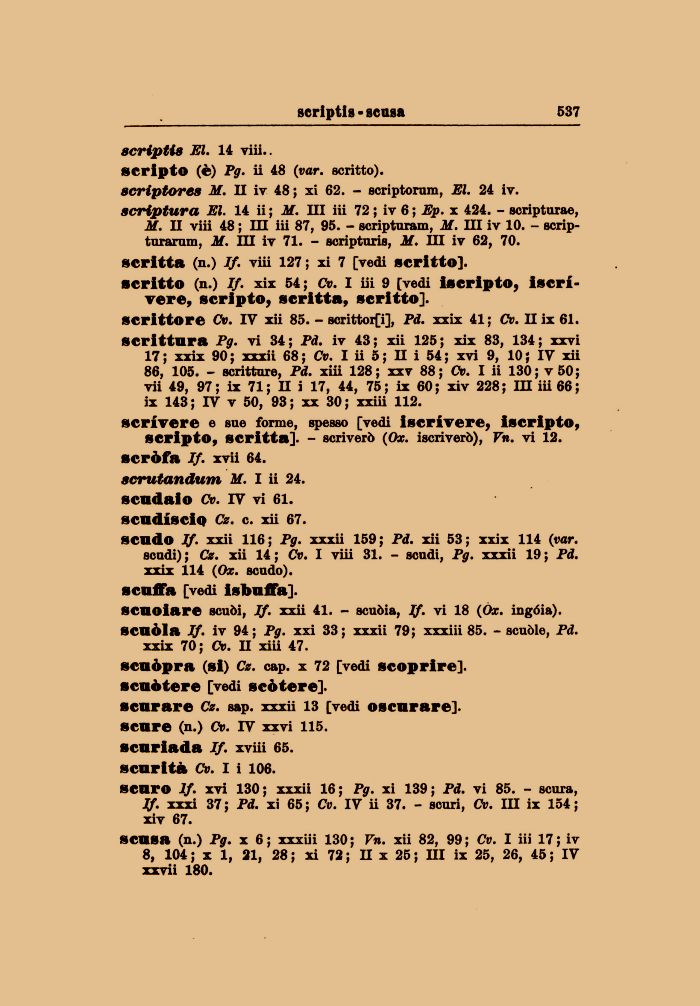 acriptia El. 14 viii.. scripto (è) Pg. ii 48 (var. scritto). scriptores M. II iv 48 ; xi 62. - scriptorum, El. 24 iv. acriptura El. 14 ii ; M. Ili iii 72 ; iv 6 ; Ep. x 424. - scripturae, M. II viii 48 ; IH iii 87, 95. - scripturam, M. Ili iv 10. - scrip-turarum, M. Ili iv 71. - scripturis, M. Ili iv 62, 70.