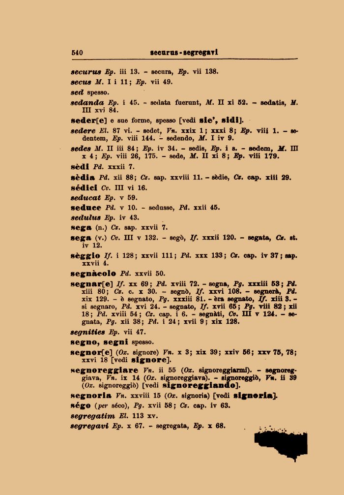 segnoria Vn. xxviii 15 (Ox. signoria) [vedi signoria], ségo (per séco), Pg. xvii 58 ; Cz. cap. iv 63. segregatim El. 113 xv.