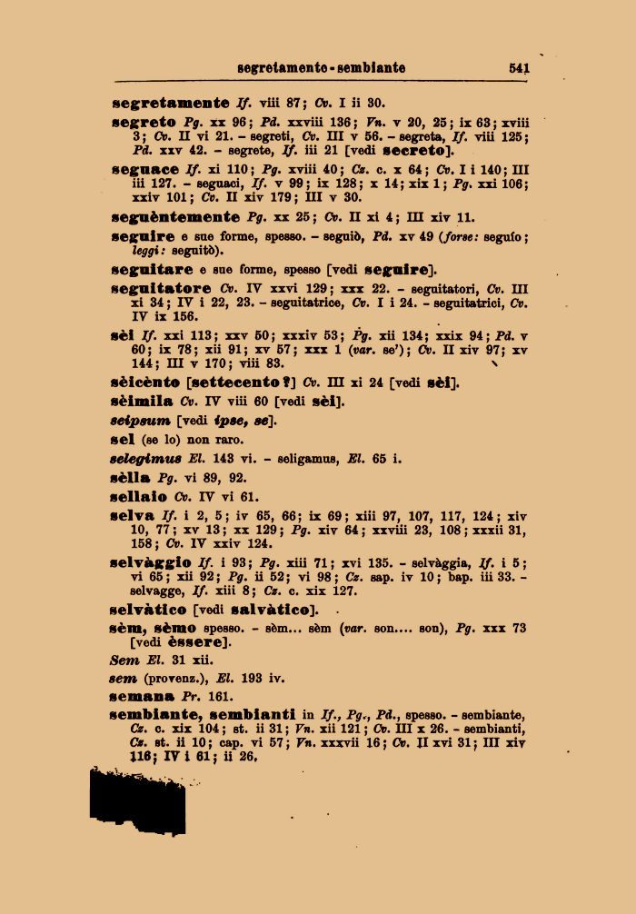 selva If. i 2, 5; iv 65, 66; ix 69; xiii 97, 107, 117, 124; xiv 10, 77 ; xv 13 ; xx 129 ; Pg. xiv 64 ; xxviii 23, 108 ; xxxii 31, 158 ; Cv. IV xxiv 124.