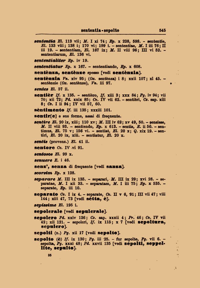 sententia El. 113 vii; Jf. I xi 74; Ep. x 228, 598. - sententie, El. 133 viii; 138 i; 170 vi; 199 i. - sententiae, Jf. I iii 76; II iii 19. - sententiam, El. 167 ix ; Jf. II viii 96 ; HI vi 52. -sententiarum, El. 136 vi.
