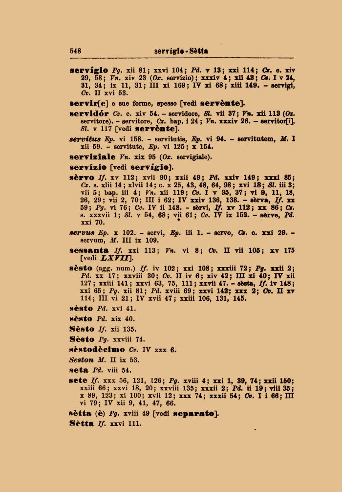 sèrvo If. xv 112; xvii 90; xxii 49; Pd. xxiv 149; xxxi 85; Cz. s. xiii 14 ; xlvii 14; e. x 25, 43, 48, 64, 98 ; xvi 18; SI. iii 3; vii 5; bap. iii 4; Vn. xii 119; Cv. I v 35, 37; vi 9, 11, 18, 26, 29; vii 2, 70; III i 62; IV xxiv 136, 138. - sèrva, If. xx 59 ; Pg. vi 76 ; Cv. IV ii 148. - sèrvi, If. xv 112 ; xx 86 ; Cz. s. xxxvii 1 ; SI. v 54, 68 ; vii 61 ; Cv. IV ix 152. - sèrve, Pd. xxi 70.
