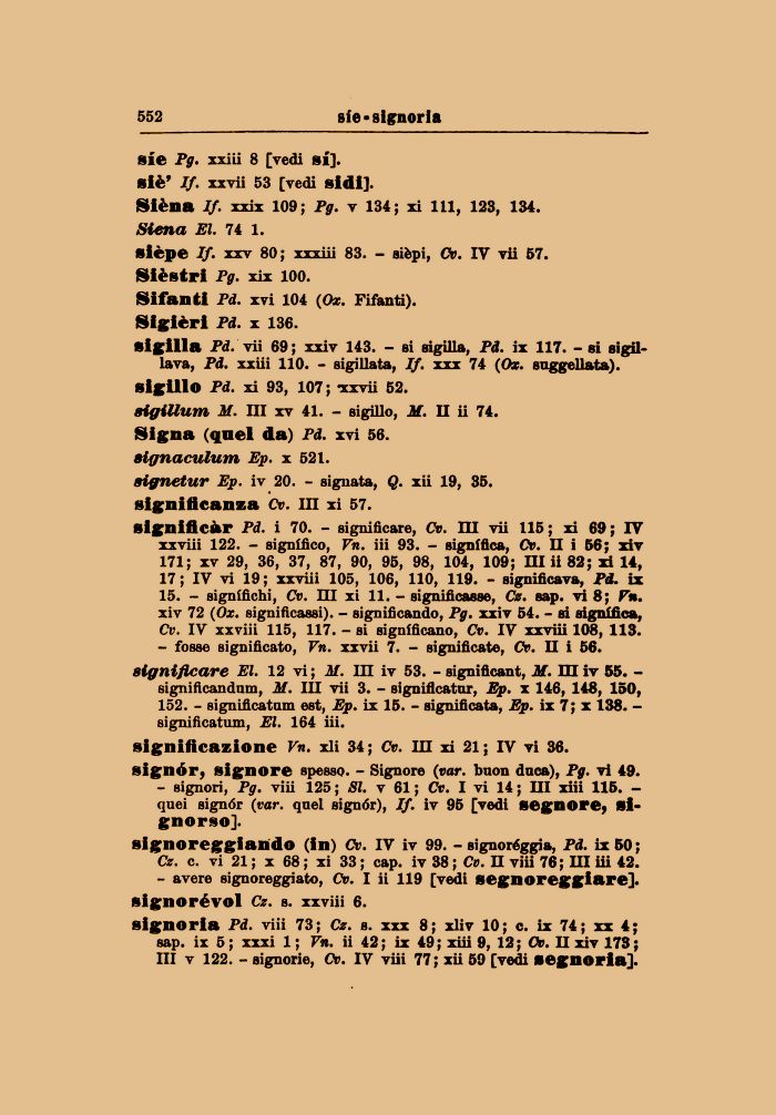Significar Pd. i 70. - significare, Cv. IU vii 115 ; xi 69 ; IV xxviii 122. - significo, Vn. iii 93. - significa, Cv. II i 56; xiv 171; xv 29, 36, 37, 87, 90, 95, 98, 104, 109; HI ii 82; xi 14, 17 ; IV vi 19 ; xxviii 105, 106, 110, 119. - significava, Pd. ix 15. - significhi, Cv. HI xi 11. - significasse, Cz. sap. vi 8; Vn. xiv 72 (Ox. significassi). - significando, Pg. xxiv 54. - si significa, Cv. IV xxviii 115, 117. - si significano, Cv. IV xxviii 108, 113.