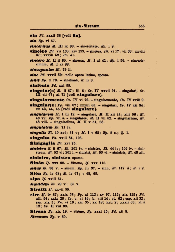 singulis El. 10 xvi ; 31 v ; M. I v 62 ; Ep. 5 s. ; Q. 1. singulto Vn. xxiii 84, 106. Slnlgàglia Pd. xvi 75.